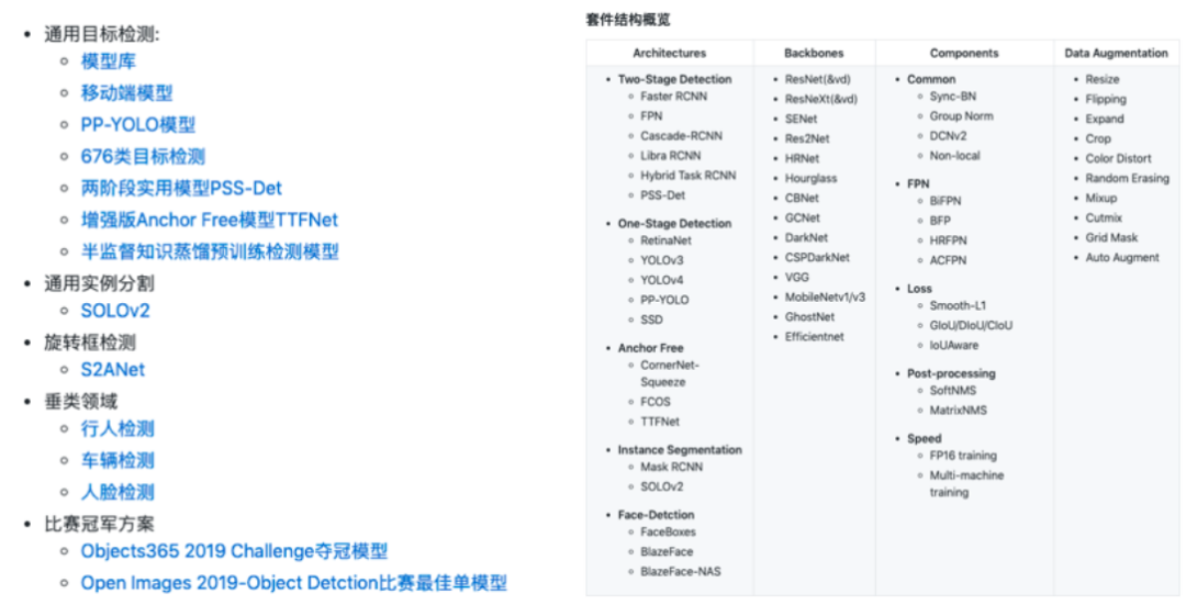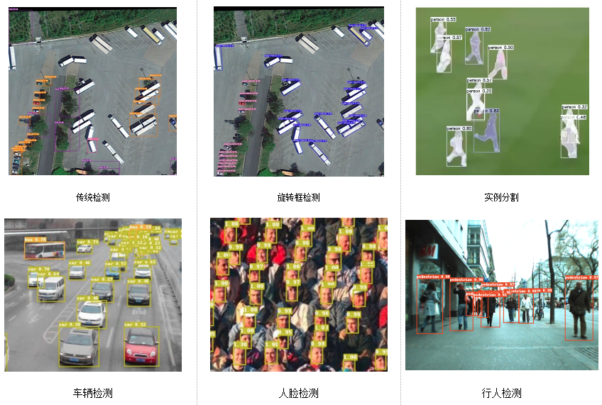 除了以上全系列通用目标检测算法外,PaddleDetection2.0还额外覆盖旋转框检测、实例分割、行人检测、人脸检测、车辆检测等垂类任务。
