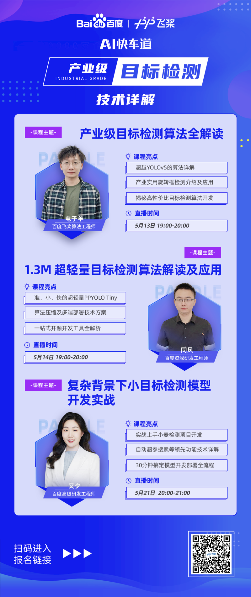 百度飞桨AI快车道为了满足大家的需求,将于5月13、14、21日开设“目标检测技术3日直播课”,由百度资深研发工程师倾囊相授多年“炼丹”经验,赶紧扫码报名加入PaddleDetection技术交流群上车吧!更多课程及产品动态,将在群里及时公告。