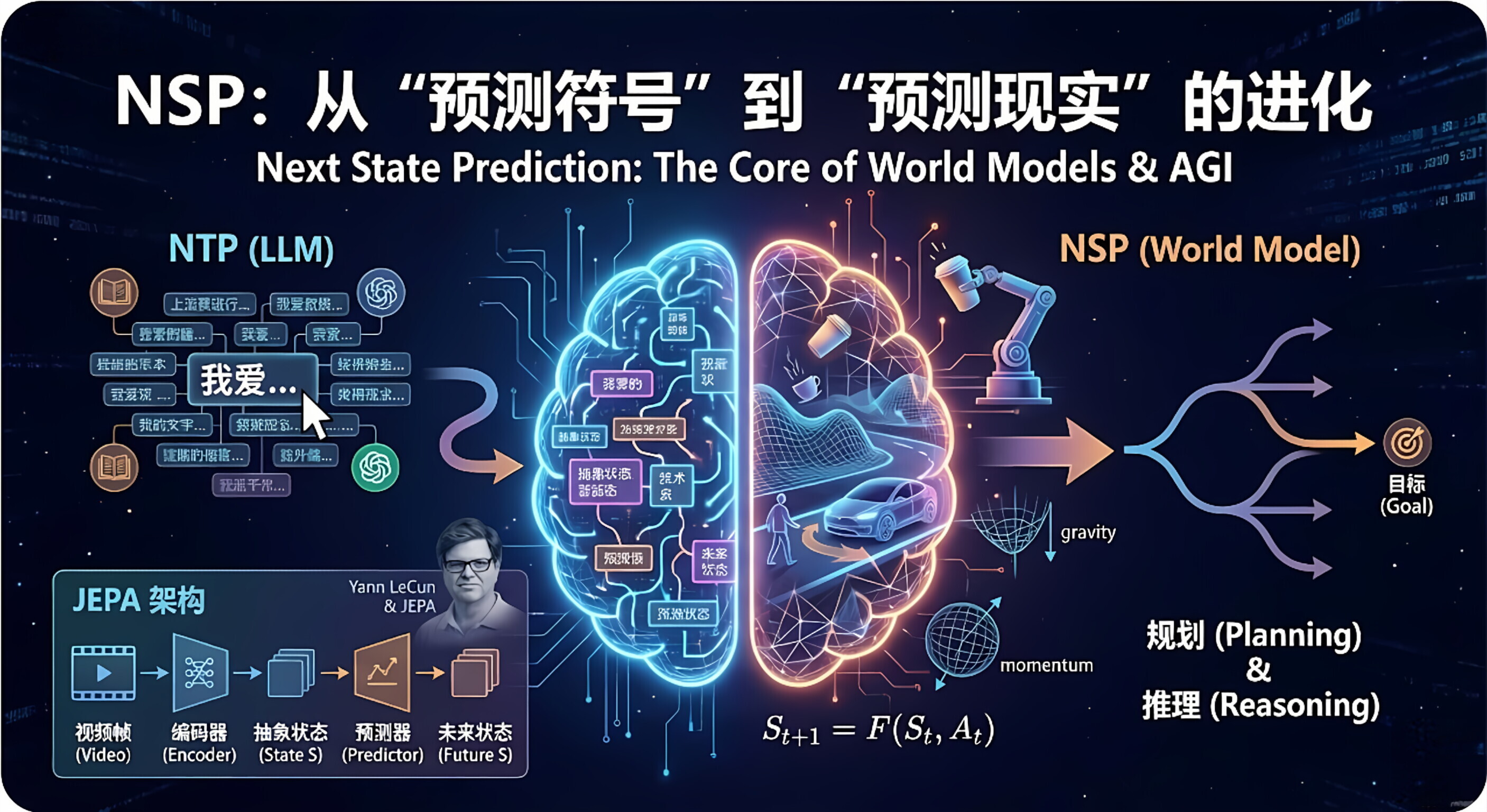 下一代AI的核心突破:从语言预测到状态预测NSP(下一状态预测)标志着AI从语言模型向世界模型的进化关键。与NTP(下一词预测)不同,NSP让AI理解物理规律和因果关系,而不仅是文本概率。其核心在于预测环境状态变化,而非像素细节,通过抽象特征向量捕捉本质规律。Yann LeCun提出的JEPA架构实现了这一理念,在抽象空间进行状态推演。NSP赋予AI规划能力,使其能预判动作后果并选择最优方案,这是