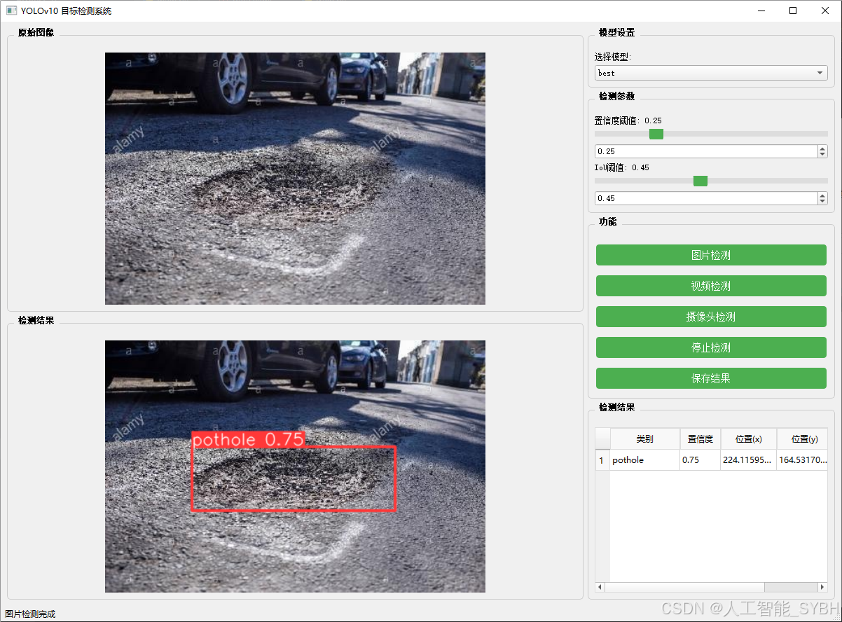 定位与测量:系统能给出坑洼的位置信息(边界框)和尺寸估算