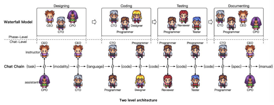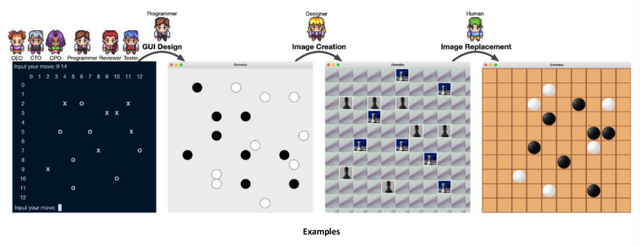 ChatDev是一家虚拟聊天软件开发公司,由阶段级和聊天级组件组成,如图18所示。不同角色的智能体(如首席执行官,专业程序员,测试工程师和艺术设计师)相互协作完成特定的软件开发任务。以图19中的实例为例,这些智能体协同工作的成果是一款产品软件:“设计一个基础的五子棋游戏”。在这一项目中,每个角色都发挥了不可或缺的作用,共同推动了项目的成功实施。