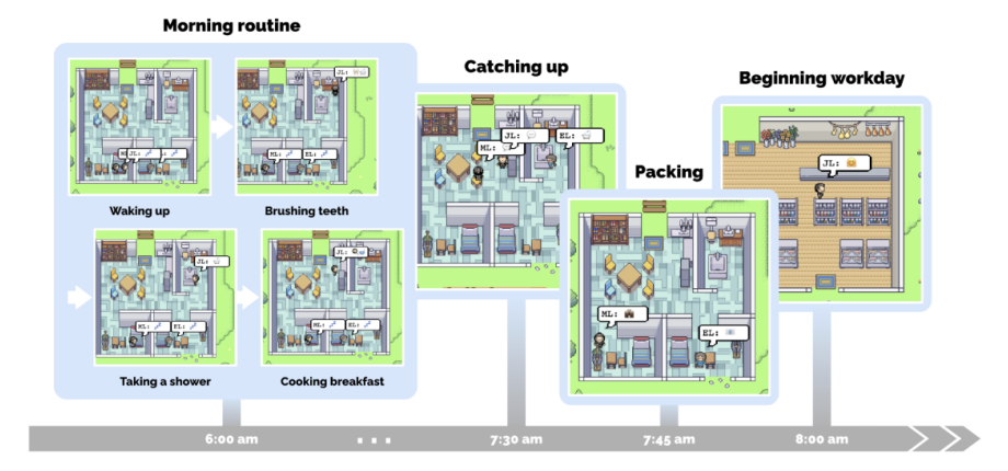 随着时间在沙盒世界中流逝,它们彼此交流并与世界互动。随之而来的是,它们的行为逐渐进化、构筑起记忆和相互之间的关系并且在联合活动中相互协作。如图3所示,表示的是基于生成型智能体的示例。图中的约翰早上6点左右起床,完成晨间例行工作,包括刷牙、淋浴和吃早餐。他简单地与妻子梅和儿子埃迪道别,然后开始新的一天的工作。