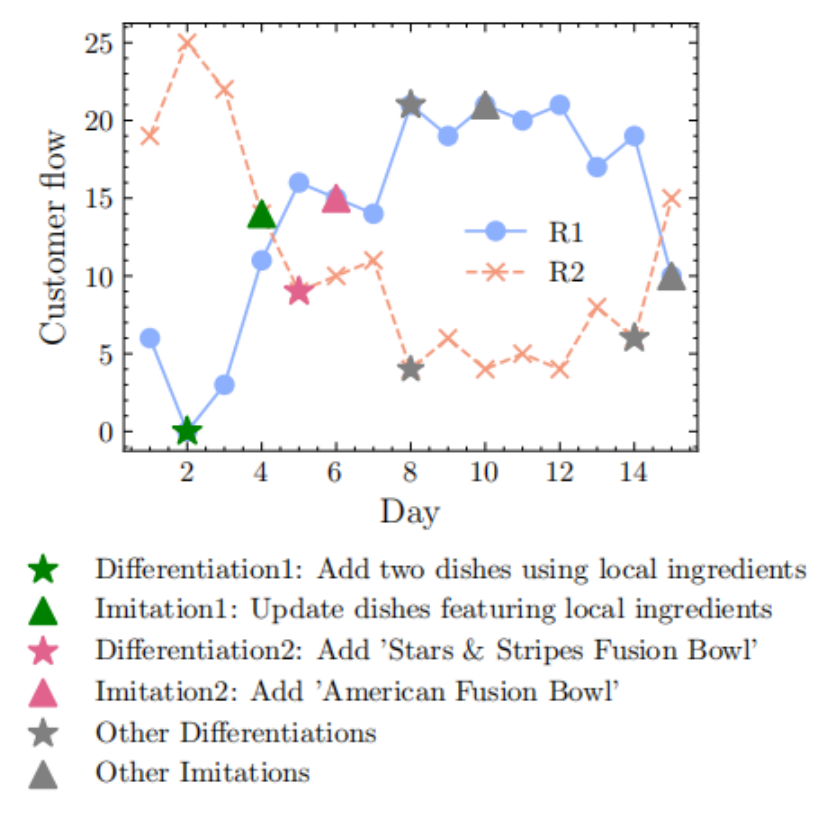 实验结果如下:图9描述了竞争中两家餐厅的模仿与差异化,图10描述了相似和不同菜肴的比例。研究结果表明,模拟中的智能体行为符合经典的社会学和经济学理论。智能体可以有效地用于模拟竞争环境,并为未来社会学、经济学及人类行为研究提供了一个潜在的实验平台。