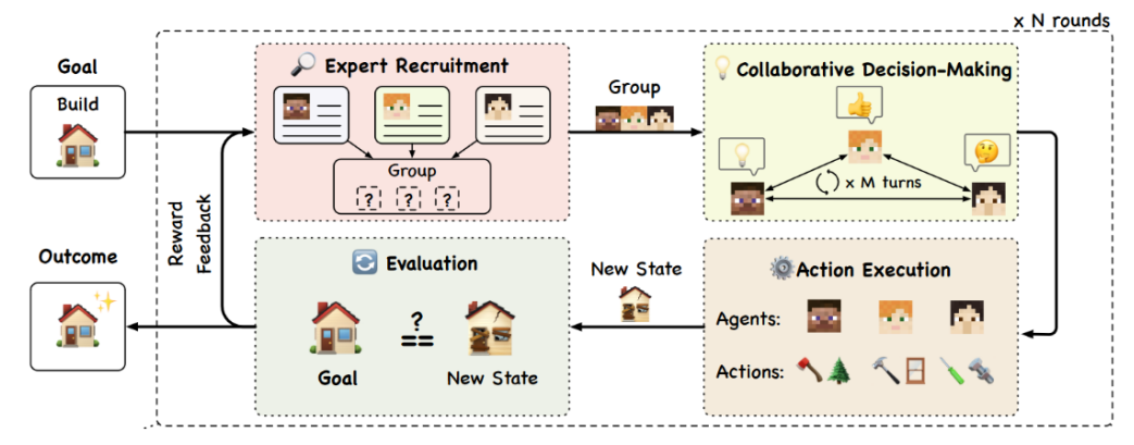 AgentVerse提出了一个用于多智能体协作的通用流程,如图13所示,分为四个阶段:“智能体招聘”、“协作决策”、“行动执行”和“评估与反馈”。通过多次迭代,每次迭代中智能体的角色都会发生变化,不同的智能体通过合作成功完成了任务。AgentVerse在完成任务求解问题的同时,也可以用于仿真,如游戏、社会行为等。