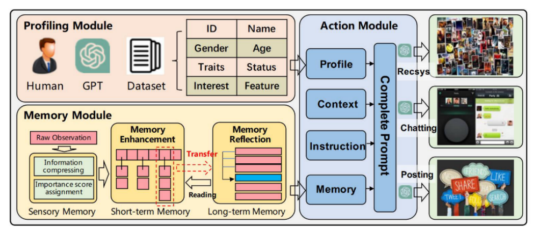 如图11所示,单智能体的框架由分析模块、记忆模块和动作模块组成。分析模块和记忆模块共同影响动作模块,从而产生不同类型的用户行为。如图12所示,通过主动采访智能体进行系统干预的案例分析可得,在进行系统干预后,智能体能够根据自己的喜好成功改变推荐的电影。