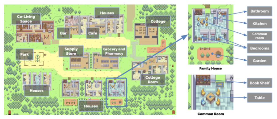 在这个沙盘世界中,区域带有标记。如图2所示,根节点描述的是整个世界,子节点表示区域而叶节点描述的是具体的对象。Smallville 是一个典型的小村庄,拥有着咖啡馆、酒吧、公园、学校、宿舍、房屋和商店。它还定义了使这些空间发挥作用的子区域和物体,例如房屋中有厨房、厨房中还有炉灶。