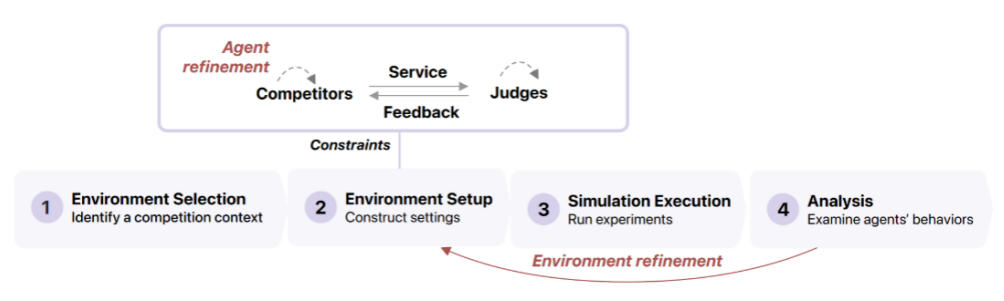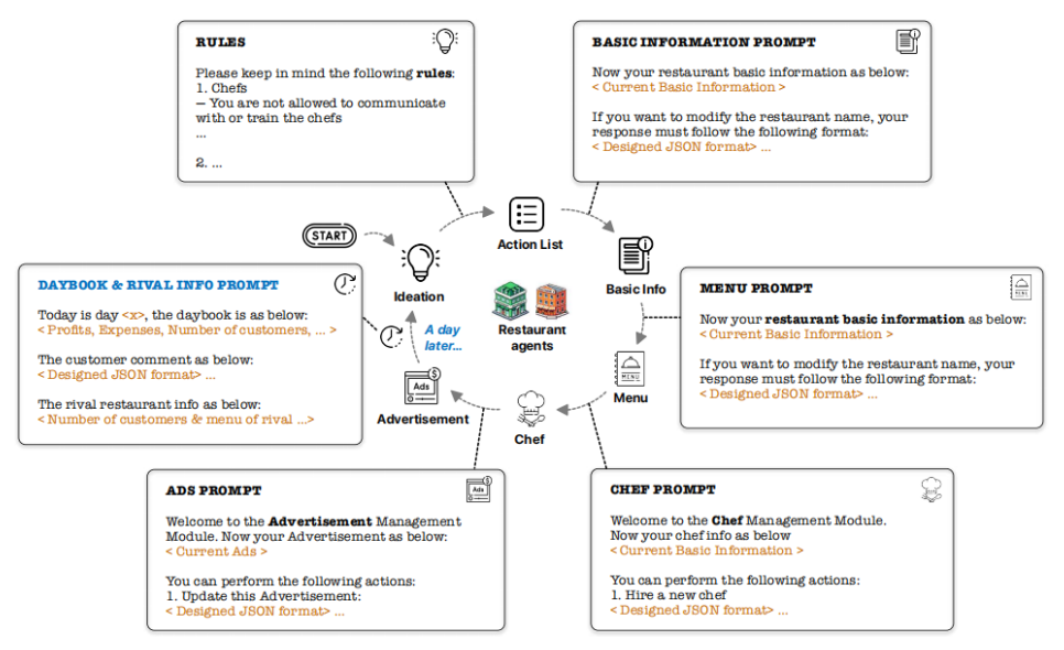 如图6所示,研究者等人提出了一个名为CompeteAI的框架来研究智能体的竞争行为。这个框架适用于各种场景,并被应用于一个虚拟小镇的模拟环境中。在该环境中,有两类智能体:餐厅智能体和顾客智能体。图7描述了餐厅智能体经营餐馆的过程,图8描述了顾客智能体用餐流程。餐厅智能体相互竞争以吸引更多的顾客,而顾客智能体根据自身需求和餐厅表现做出选择,提供反馈。这一过程推动了餐厅智能体不断改进其运营策略。
