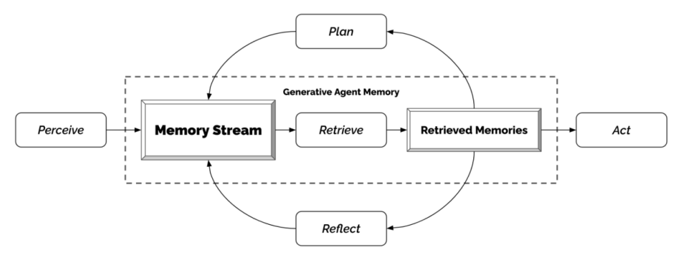 智能体能够感知其环境,所有的感知信息都会被保存到一个称为“记忆流”(memory stream)的综合记录中。该记录系统会存储智能体的所有经历和观察,形成其行为的基础。在感知到外部环境后,生成式智能体架构会从记忆流中检索与当前情境相关的记忆,以此来决定智能体的下一步行动。通过这些检索到的记忆,智能体不仅能够做出即时反应,还能制定长期计划,并生成更高层次的反思。