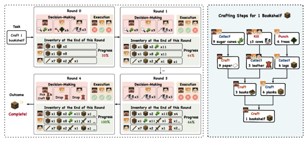 此外,在游戏Minecraft中,不同的智能体操纵不同的角色一起完成任务,如图16所示。
