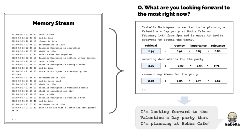 论文中实现了检索机制:根据输入的智能体当下的处境,返回一个记忆流的子集传递给LLM。子集的选择取决于智能体认为哪些事情对于作出行动比较重要。