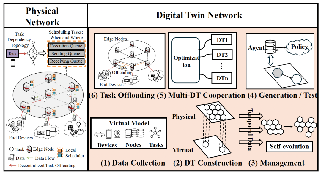 分层数字孪生架构图。它展示了工作流程:(1) 从“Physical Network”(物理网络)收集数据。(2) 构建“Virtual Model”(虚拟模型)。(3) 在“Management”(管理)阶段,Agent与Policy(策略)交互,DTs之间也进行“Multi-DT Cooperation”(多DT协作)。(4) 生成/测试。(5) 协作。(6) 最终执行“Task Offloading”(任务卸载)。