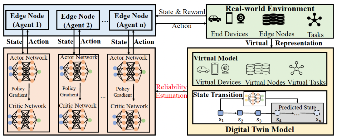 这就是DT-MARL的“集中式训练”框架图。左侧是多个Agent(Edge Node 1…n),每个Agent都有自己的Actor Network(演员网络)和Critic Network(评论家网络)。它们与“Real-world Environment”(真实环境)交互,产生“State & Reward”(状态和奖励)。同时,右侧的“Digital Twin Model”(数字孪生模型)提供了“Virtual Representation”(虚拟表示),帮助Agent进行“Reliability Estimation”(可靠性估计)和预测“Predicted State”(预测状态)。