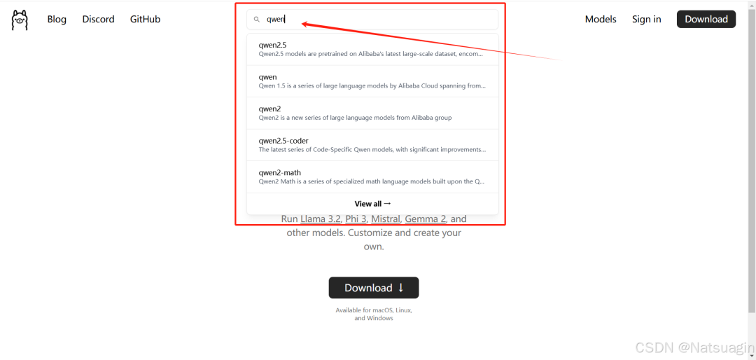 搜索模型:访问 ollama.com,在搜索框中输入“Qwen”后,敲击Enter进行查找。