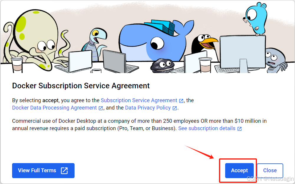 首次打开时,将出现 Docker 订阅协议,点击 Accept(接受)以继续。