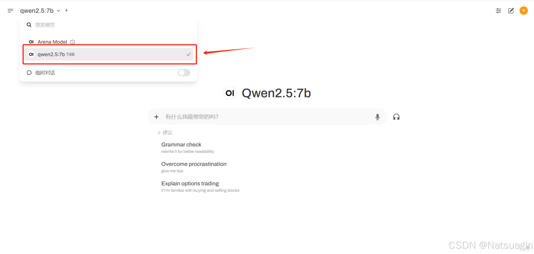 登录以后,左上角可以选择我们安装的Qwen2.5模型,如果我们安装多个模型的话,可以切换不同模型使用。