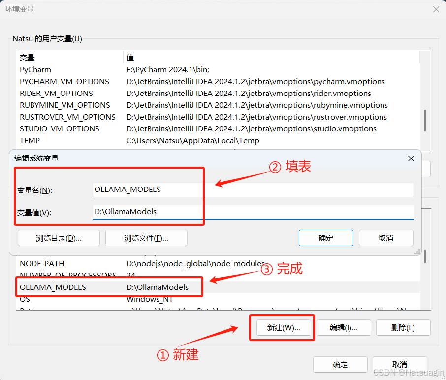或者通过新建 系统环境变量 设置 OLLAMA_MODELS,这样 Ollama 就会将模型保存到新的路径(方法二):