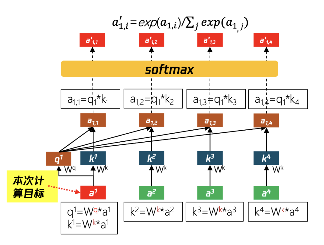 如图42所示,为Self-attention的过程,可以针对Q、K、V进行拆解: