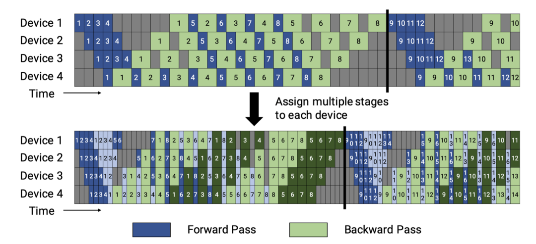 将流水线、张量和数据并行相结合,为每个worker放置多个较小的连续层子集,而不是设备商放置放连续的层(“模型块”),1个batch里面的微批次按照worker的数量m进行划分,如图43所示,上方的图是每个worker运行连续的model chunks,下方的图则进一步分拆,每个device上运行更多的micro batches,这样的效果是其闲置时间更少,利用率更高。