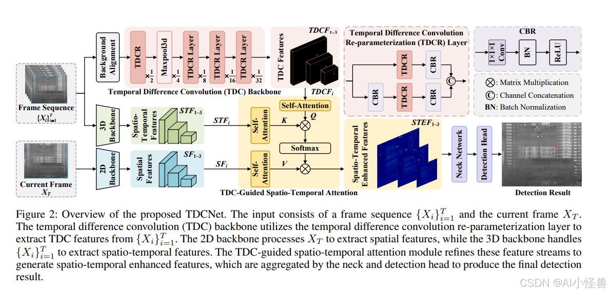 在本研究中,我们提出了一种新颖的移动红外小目标检测网络 TDCNet,如图2所示。该网络首先引入了一个时间差分卷积主干网络。随后,一个TDC引导的时空注意力模块通过将自注意力机制应用于三个不同的特征流,并以TDC特征作为查询进行交叉注意力,来有选择性地增强时空特征,从而优化特征表示。最后,我们构建了一个具有挑战性的基准数据集 IRSTD-UAV,以验证我们方法的有效性。