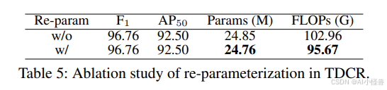 TDCR中重参数化的影响。根据表5,重参数化将参数量从24.85M减少到24.76M,将FLOPs从102.96G减少到95.67G,同时保持了稳定的检测性能,这证明了在不牺牲准确性的前提下效率得到了提升。