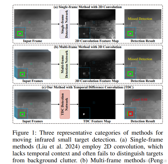 现有的移动红外小目标检测方法主要在如何处理空间和时间信息上有所不同。一种广泛采用的策略是在时间序列中的每一帧上独立地应用二维卷积网络。然而,帧间交互的缺乏限制了它们对时空连续性建模的能力。相反,时间差分方法则专注于帧间强度变化以捕捉运动线索,但难以提取对于鲁棒检测至关重要的空间语义表示。为了有效利用空间和时间信息,最近的方法要么采用分阶段的流程,即先通过2D卷积提取空间特征,再进行时间建模;要么使用3D卷积来联合捕获时空特征。然而,这些方法在复杂背景下往往存在运动感知能力有限或时空上下文建模不足的问题。相比之下,我们提出的TDC块将时间差分和时空卷积融合成一个统一的3D卷积表示,能够有效捕获运动上下文依赖关系,从而在复杂背景下实现鲁棒的移动红外小目标检测。