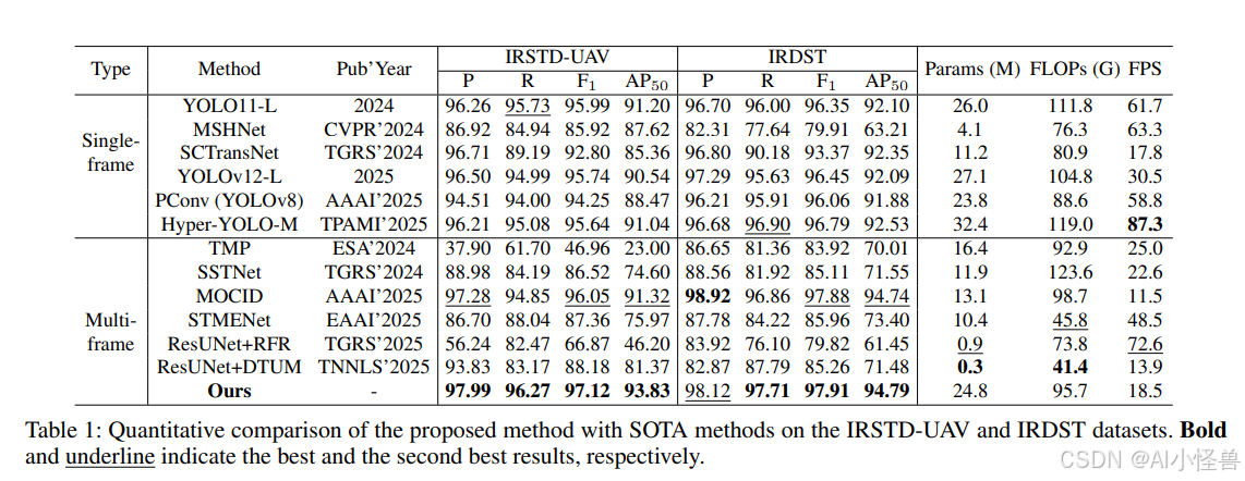 对于单帧方法,我们选取了基于CNN的通用检测器YOLO11-L、YOLOv12-L和Hyper-YOLO-M,以及专门为IRSTD设计的MSHNet和PConv。此外,我们还选取了基于Transformer的红外专用基线模型SCTransNet。对于多帧方法,我们选取了红外专用的基于CNN的方法,包括TMP、SSTNet、MOCID、STMENet、RFR和DTUM。