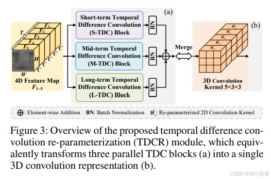 如图3所示,我们提出了一种新颖的 TDCR 模块,以增强多时间尺度上的时空上下文特征建模能力。在训练期间,TDCR 由三个并行分支组成:短期TDC块、中期TDC块和长期TDC块(图4)。每个分支专门设计用于捕获不同时间尺度上的时间依赖关系。这些块的输出分别由批归一化层进行独立归一化,然后通过求和进行聚合。在推理阶段,我们将三个分支重参数化为一个统一的单3D卷积,以简化推理流程,同时保留多尺度时间建模能力。
