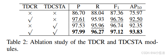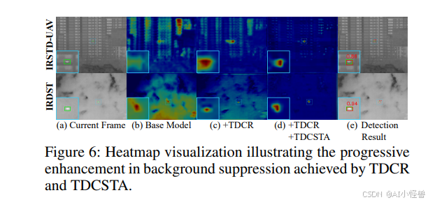 提出的TDCR和TDCSTA的影响。如表2所示,TDCR和TDCSTA各自独立地为基线模型带来了性能提升。具体而言,TDCR将精确率提升至97.61,平均精确度提升至92.50;而TDCSTA将召回率提升至95.96,F1分数提升至96.74。TDCR和TDCSTA结合使用取得了最优结果,突显了它们的互补优势。为了更好地理解其效果,我们在图6中可视化了热力图。与基础模型相比,TDCR在目标上产生了更集中、更易区分的激活。在应用TDCSTA后,无关的背景激活被显著抑制,进一步增强了杂乱红外场景中目标的显著性。