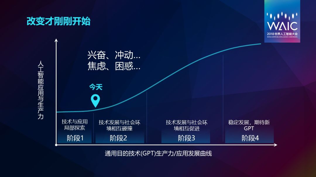 所有通用目的技术的应用一定会有一个过程。通常华为看待一个产业会分为4个阶段:第一个是技术与应用局部探索的阶段,第二个阶段是技术发展与社会环境相互碰撞。我们认为今天的人工智能是在第二个阶段的开始。人工智能的发展带来了兴奋和冲动,也有一丝焦虑和困惑,但是人工智能终将改变这些行业。