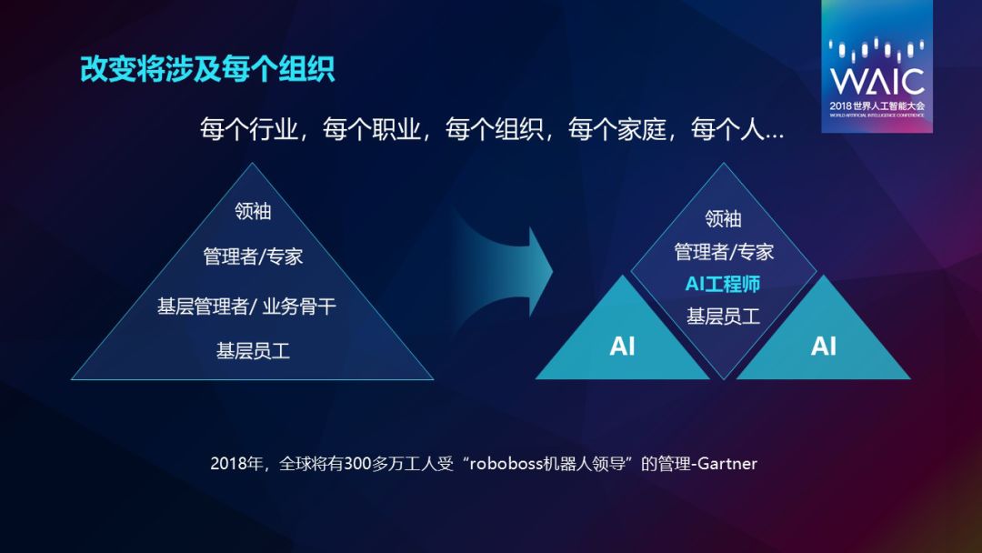 人工智能将会改变每个行业、每个职业、每个组织、每个家庭和每个人。我们一直都说是行业+AI,而不是AI+行业。今天组织的人才结构是这样的:上方是商业领袖,下方是高级管理者/专家,然后是基层管理者/业务骨干和基层员工。未来使用人工智能以后,会改变我们整个组织的人才结构,从上方的商业领袖、管理者到基层员工,中间一定有AI工程师。中间这些重复性的劳动一定会被人工智能所替代。
