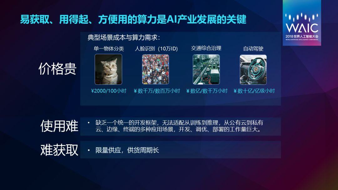 第一个是价格贵。我们现在看人工智能整个训练的过程还是很贵的,训练人脸识别、交通综合治理、自动驾驶,模型的训练成本非常高昂的。