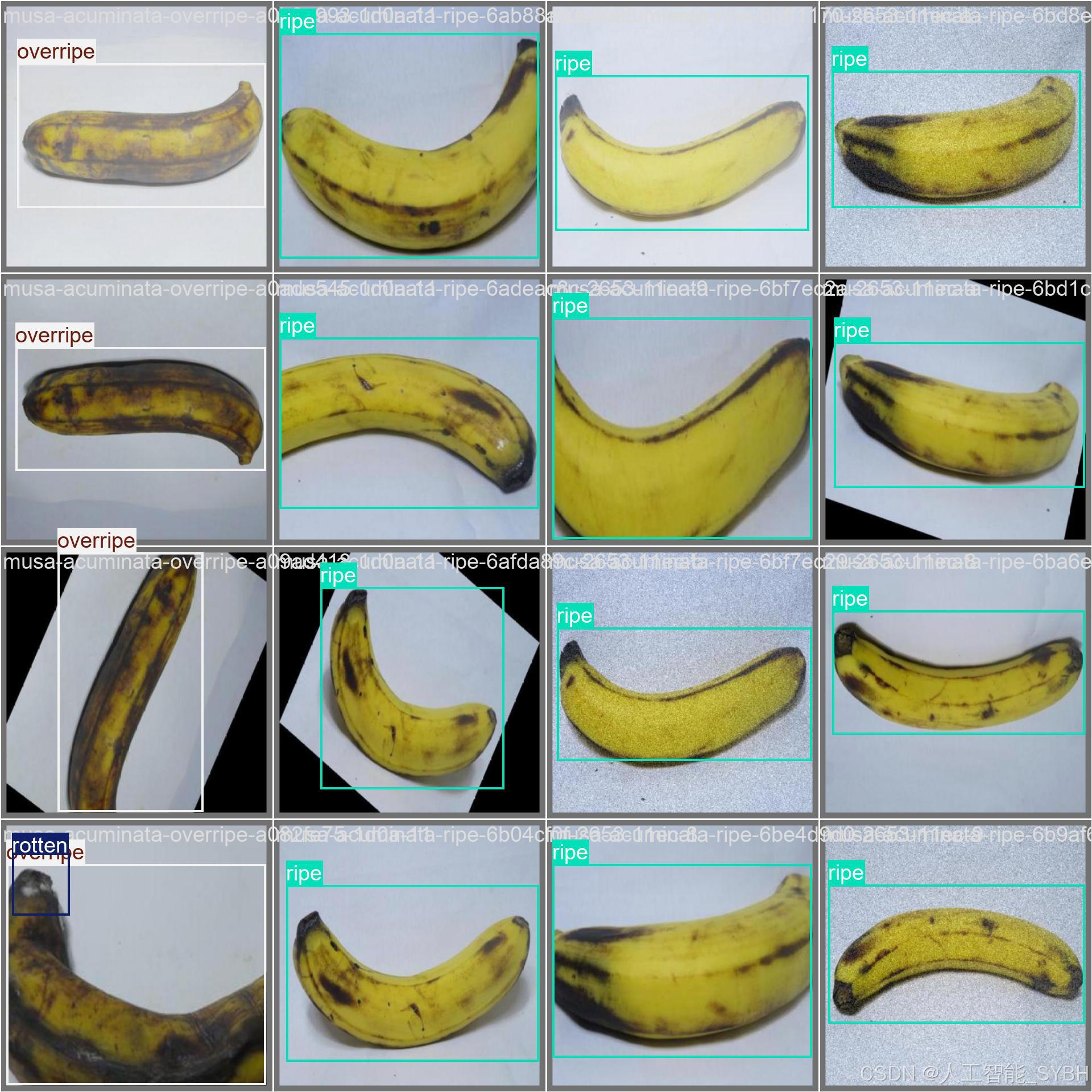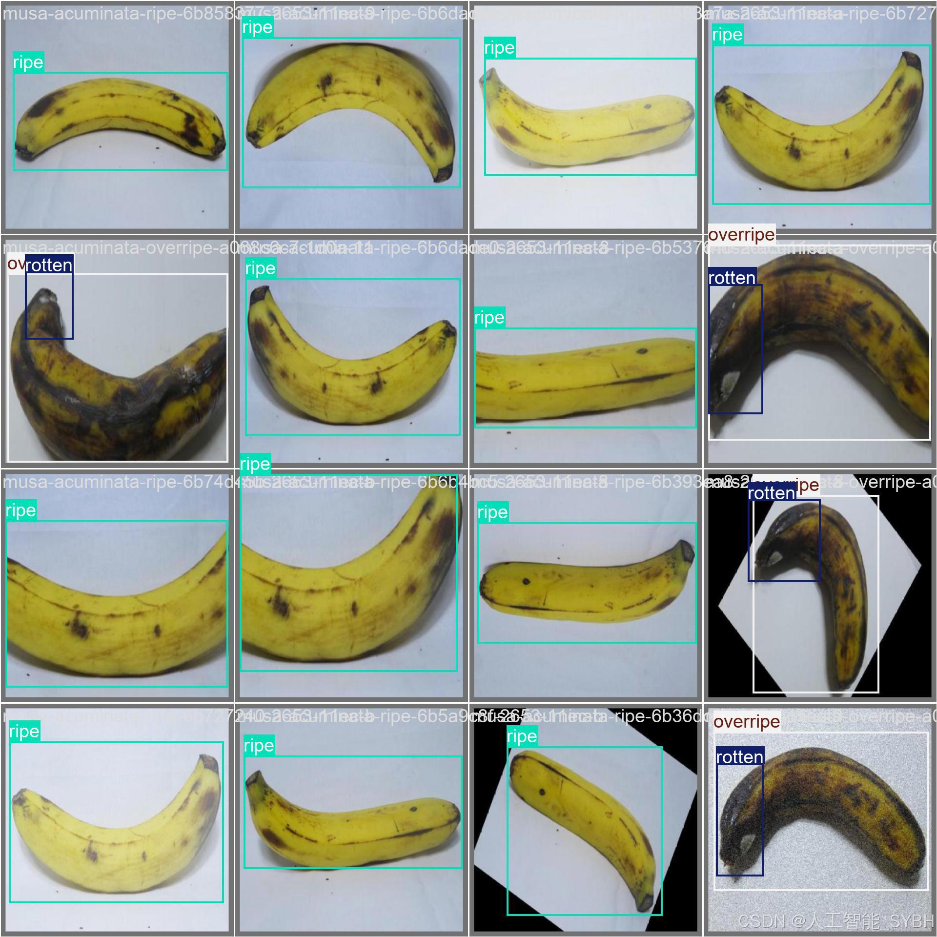 本项目基于YOLOv8目标检测算法开发了一套香蕉成熟度自动检测系统,能够准确识别和分类香蕉的6种成熟状态:新鲜成熟(freshripe)、新鲜未成熟(freshunripe)、过熟(overripe)、成熟(ripe)、腐烂(rotten)和未成熟(unripe)。系统使用大规模香蕉图像数据集进行训练,包含训练集15,792张图像、验证集1,525张图像和测试集757张图像,确保了模型对各种成熟度