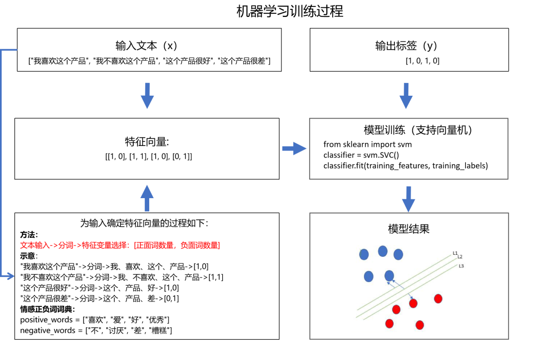 (3)特征向量:机器学习的特征变量是明确的,主要依赖人工经验选择确定,比如本案例中设计出来的特征变量有两个,分别是“正面词数量”,“负面词数量”,要判断一段文本是正面还是负面,一般首先会想到通过分词找到正负面的词,然后以这些词的频率作为x变量,因为这是最相关的。