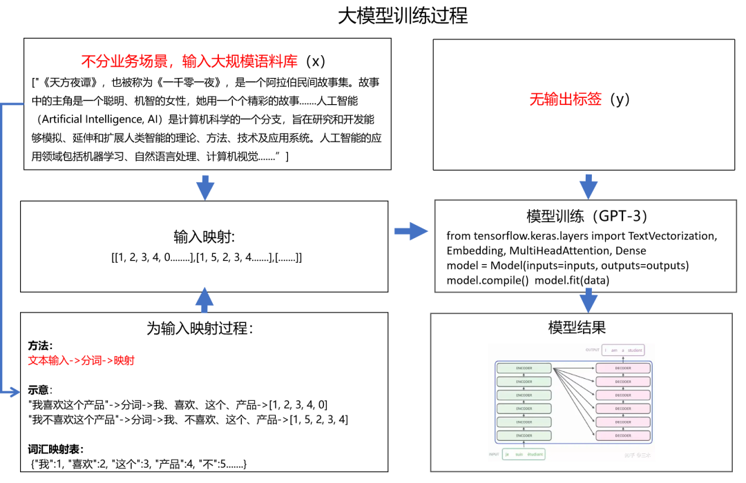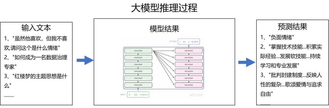 (4)推理:下图显示了大模型推理过程,其适用于任意场景,输入任意文本,预训练模型都可以基于输入的文本进行生成式回复。
