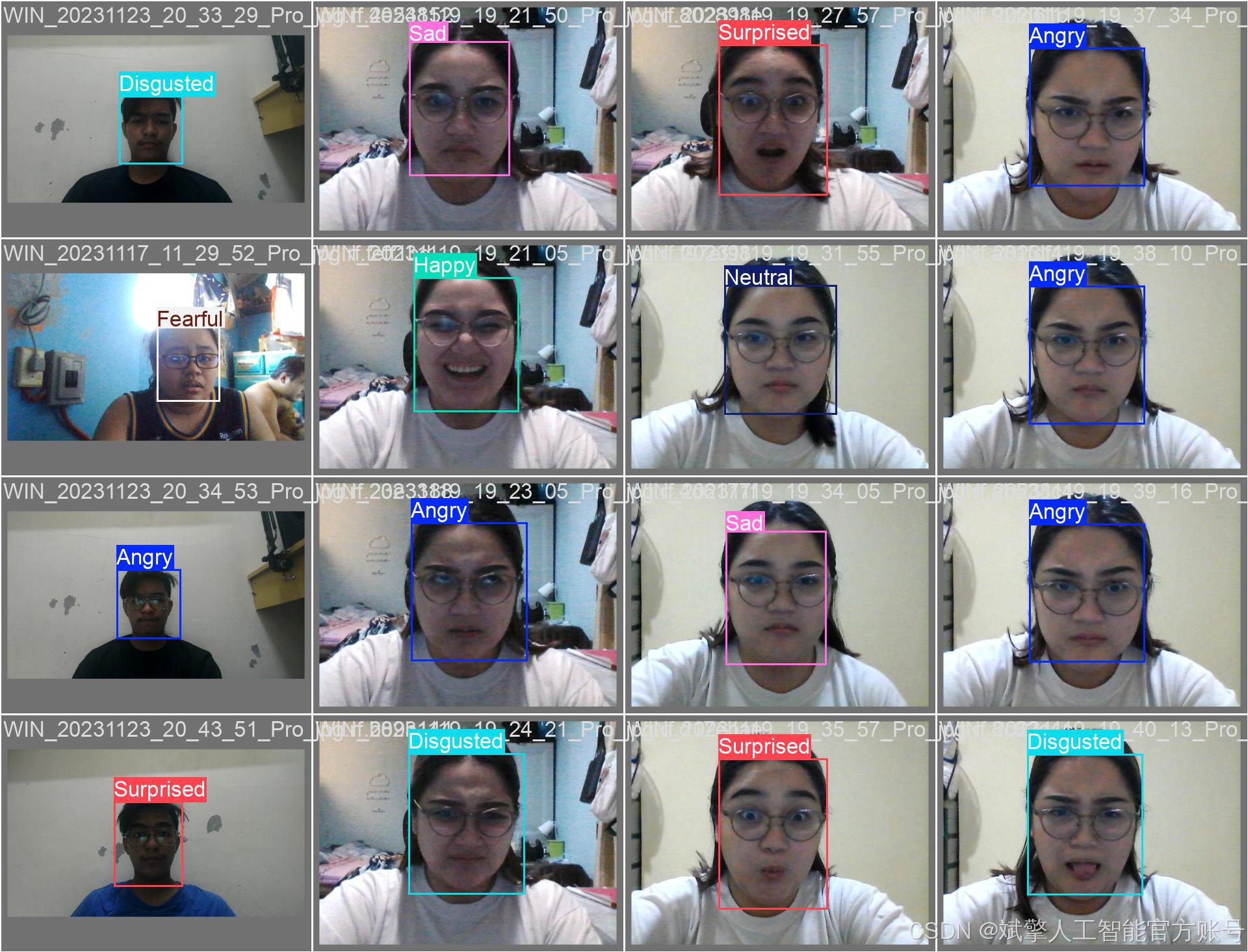 本系统采用了一个高质量的表情识别数据集,共包含 7 类基本表情,分别为:愤怒(Angry)、厌恶(Disgusted)、恐惧(Fearful)、快乐(Happy)、中性(Neutral)、悲伤(Sad)和惊讶(Surprised)。该数据集经过严格筛选和标注,确保每张图像的表情类别清晰可辨,适用于深度学习模型的训练与验证。