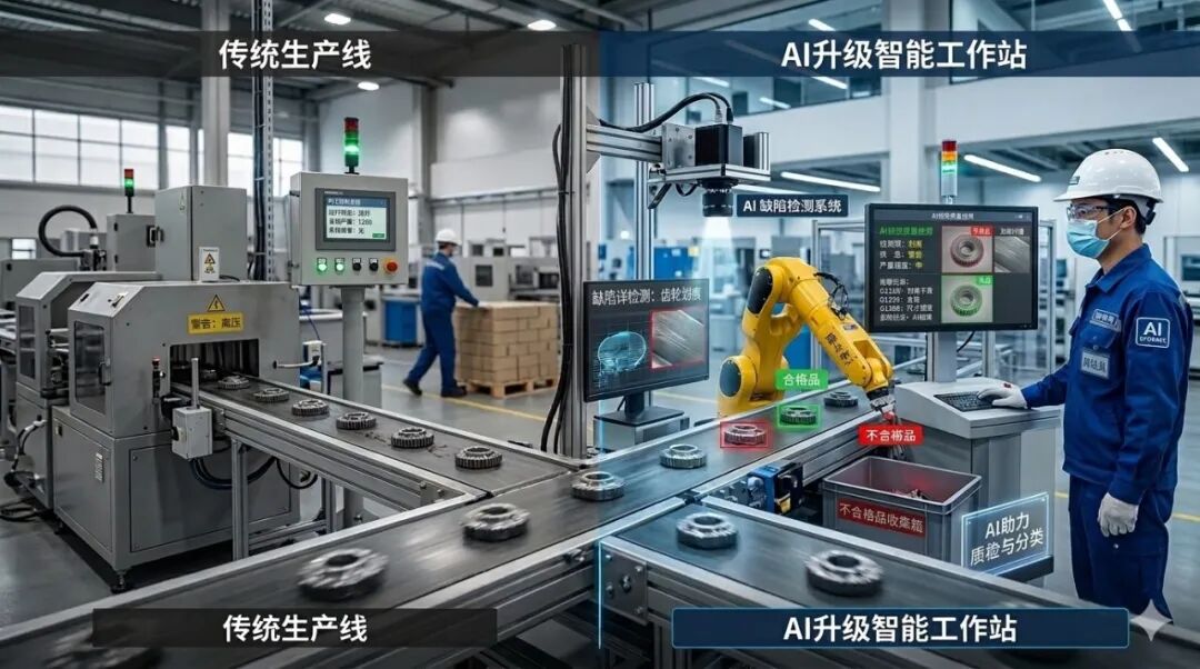 在一条工业生产线上,传统设备只能完成数据采集和控制。而在 AI 升级后,设备可以通过摄像头实时进行 缺陷检测、产品分类、异常报警。