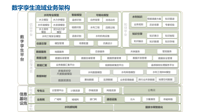 - 基础设施:水利感知网(天空地水一体化)、水利信息网、水利云建设。