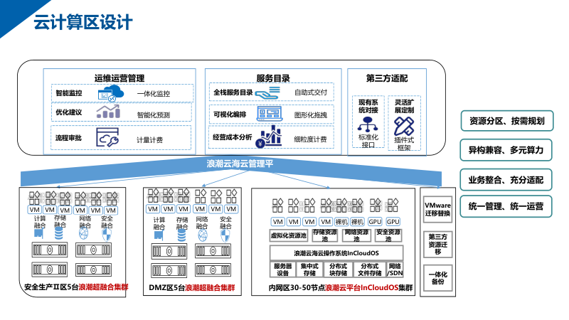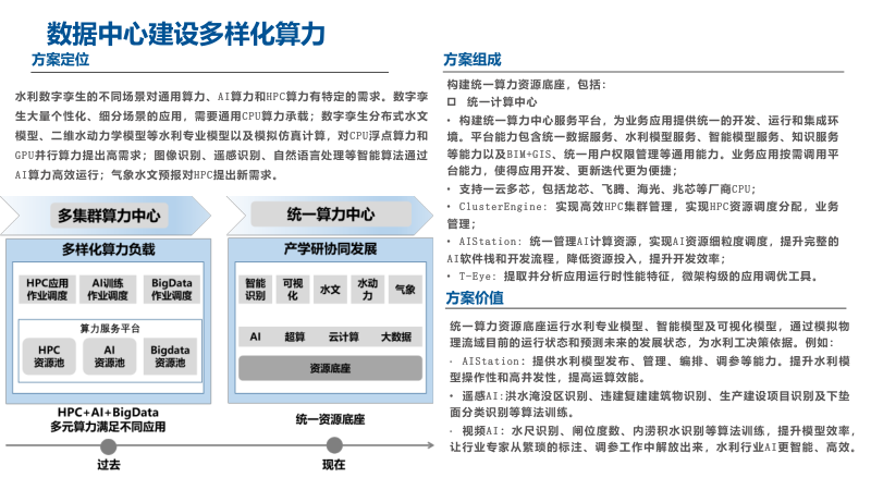 - 算力支撑:统一算力中心(通用 / AI/HPC 算力)、云平台部署与资源管理。