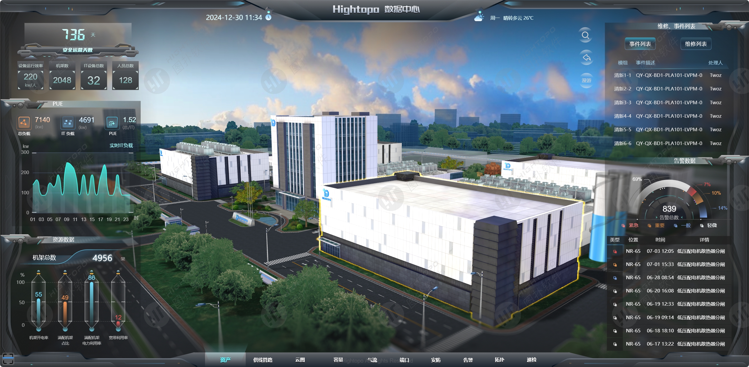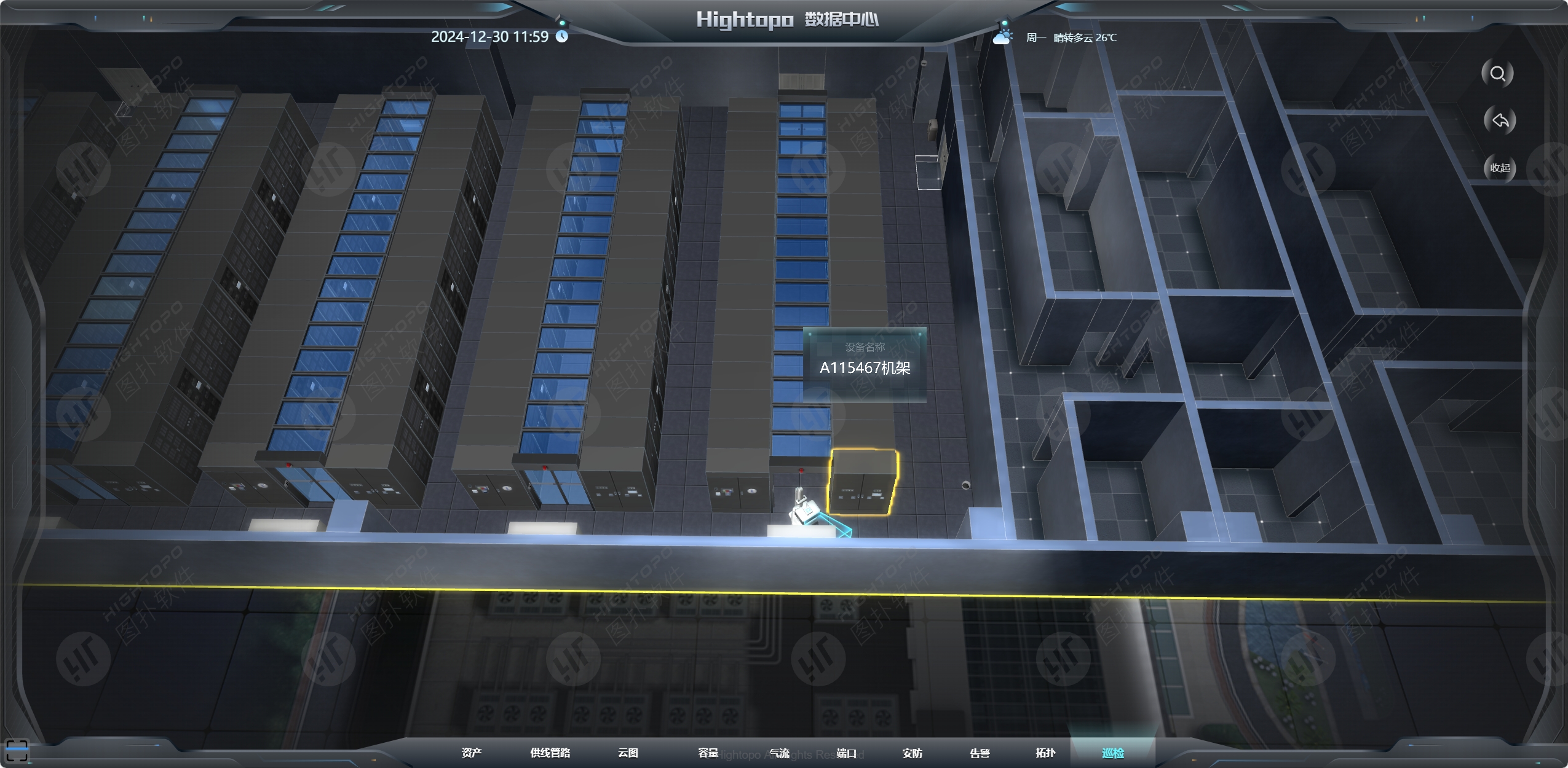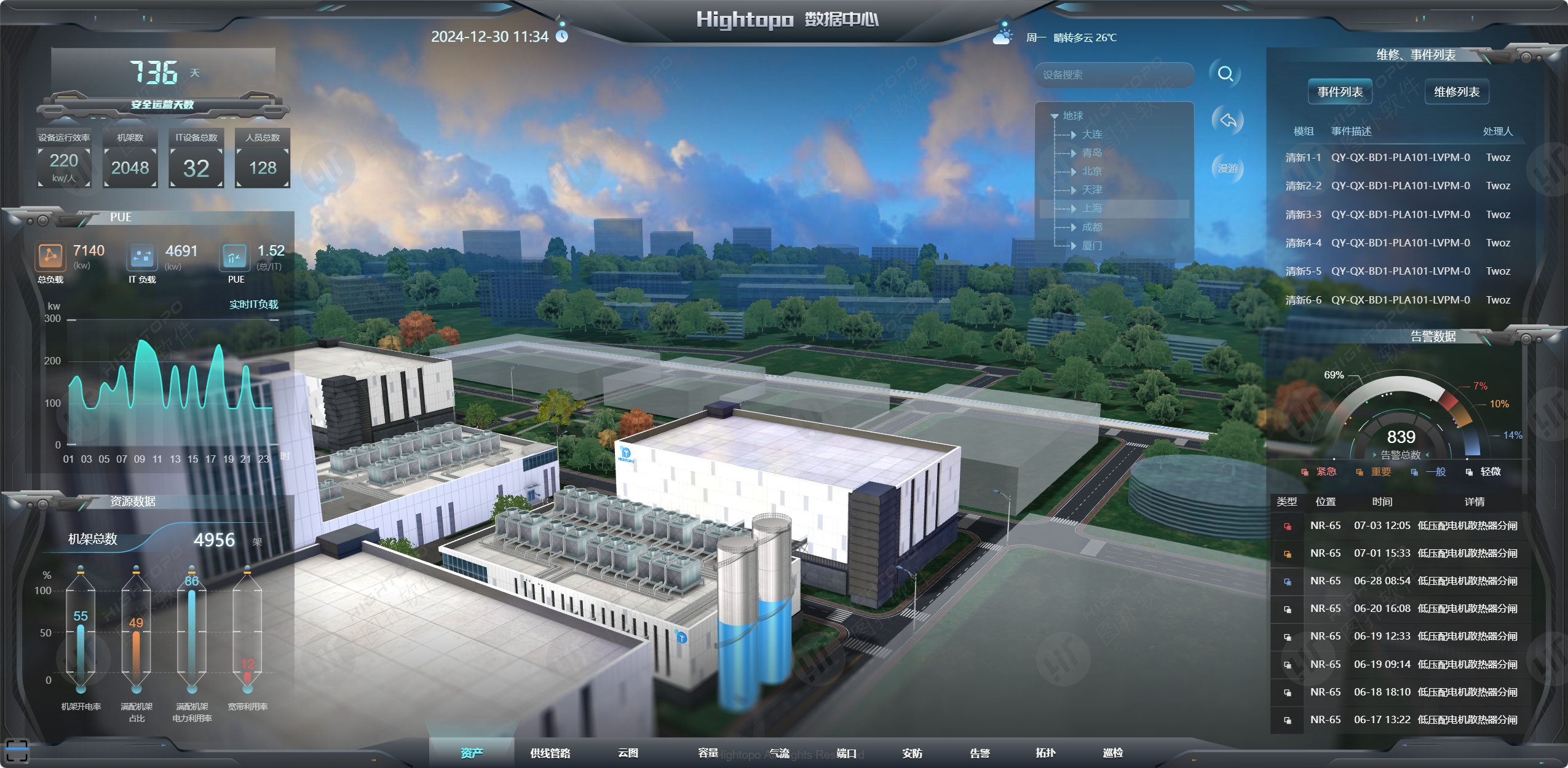 实时数据动态更新:CPU 负载、机柜温度、能耗曲线直观呈现,区域超标或过载时即刻标红预警,并自动匹配备用方案。运维无需逐个巡检,全局状态一屏掌握,设备维护、线路负载等情况一目了然。算力时代,数据中心的高效运转靠 “可视化大脑” 精准把控。数字孪生技术构建的三维平台,毫米级还原机房全貌,服务器、空调、电力链路等细节清晰可辨。从能耗优化到故障响应,从资源调度到风险预判,可视化管理让数据中心告别 “盲维