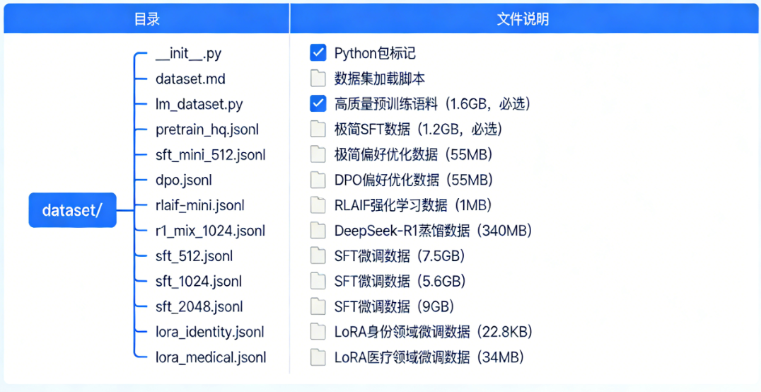 ├── dataset/ # 数据集目录:存放训练/微调所需各类数据
