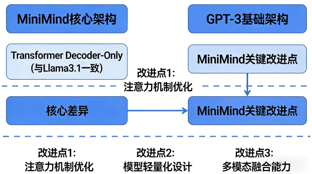 MiniMind核心沿用TransformerDecoder-Only架构(与Llama3.1一致),并在GPT-3基础上做了关键改进,核心差异点: