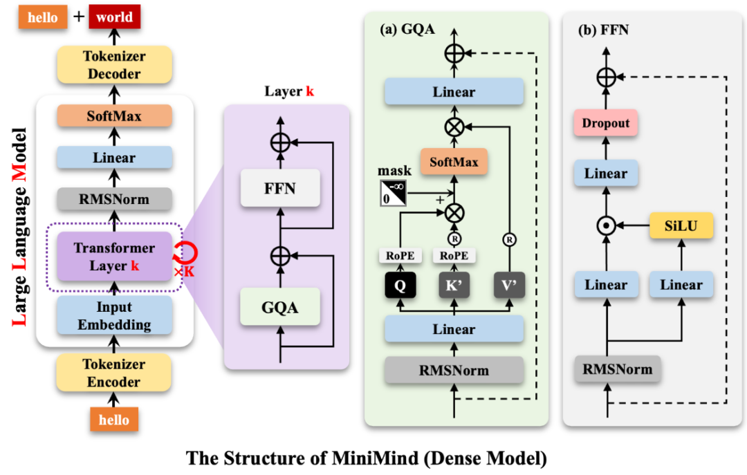MiniMind的整体结构一致,只是在RoPE计算、推理函数和FFN层的代码上做了一些小调整。 其结构如下图: