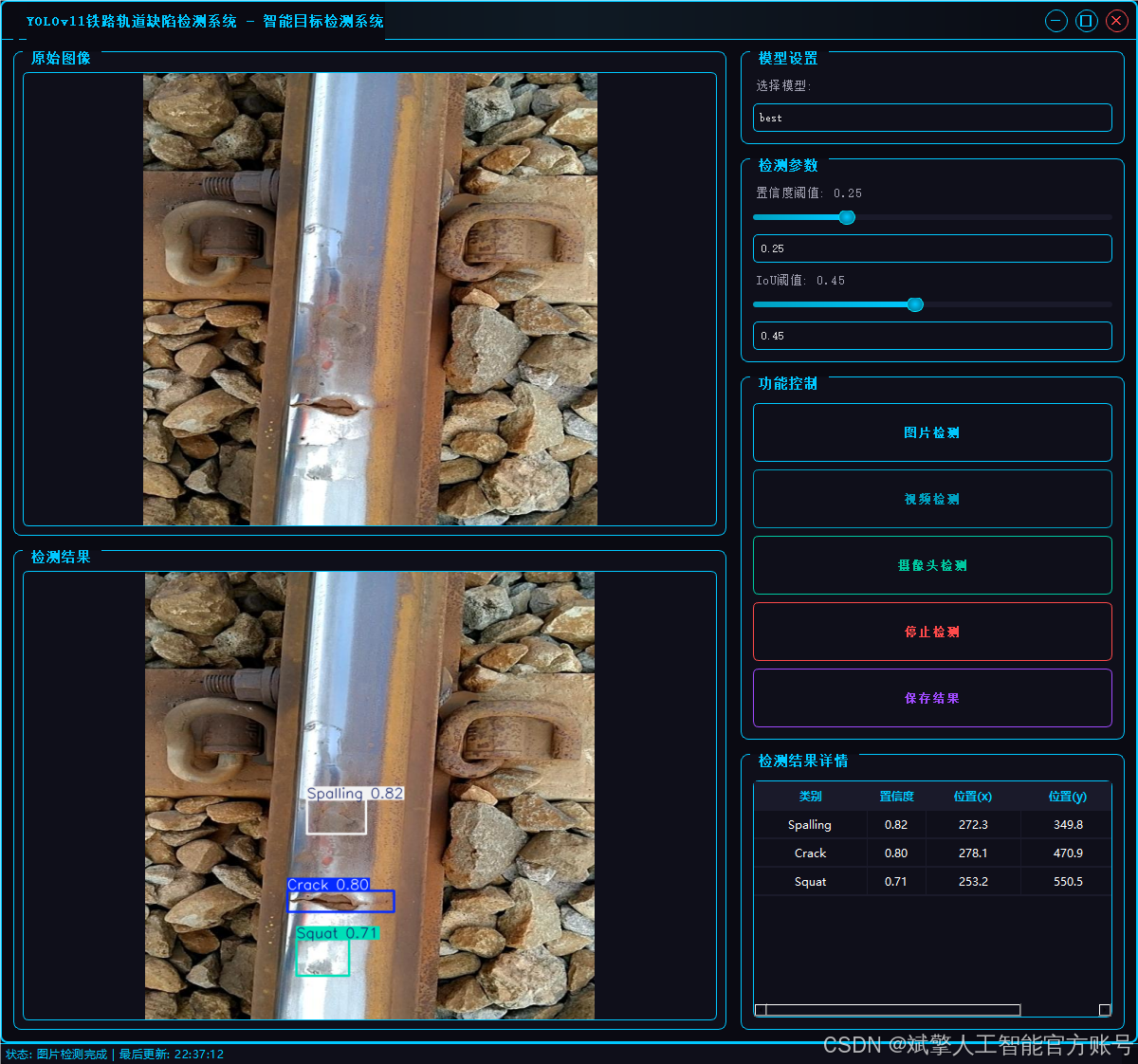 本研究基于YOLOv11算法构建铁路轨道缺陷检测系统,通过1,593张标注图像(含4类缺陷)训练模型,并开发了支持用户交互的UI界面。系统创新性地将深度学习与工程应用结合,实现了缺陷的实时检测与分类。实验验证了模型在复杂场景下的鲁棒性,为铁路智能运维提供了技术支撑。该成果对提升轨道维护效率、降低安全隐患具有重要实践价值。