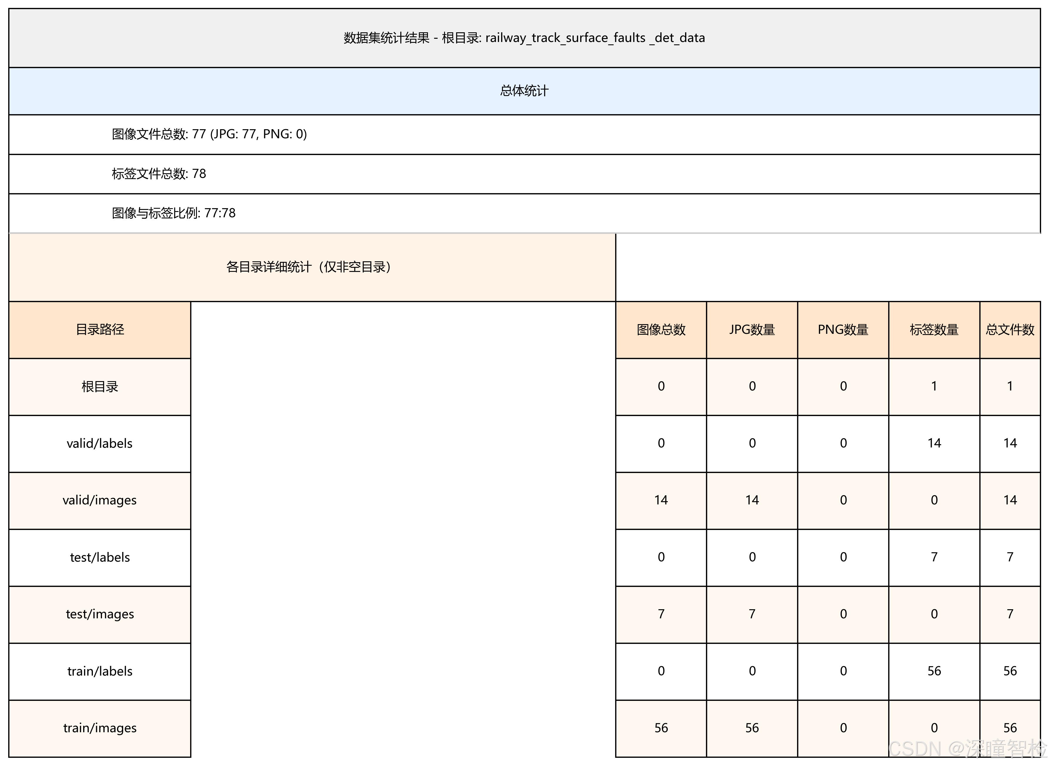 本数据集围绕铁路轨道表面的典型缺陷构建,共包含 77 张 JPG 格式的轨道场景图像,以及 78 份 YOLO 格式的 TXT 标注文件,图像与标注文件的比例为 77:78。
